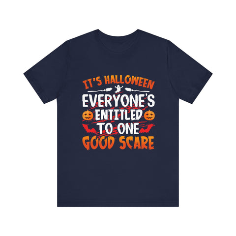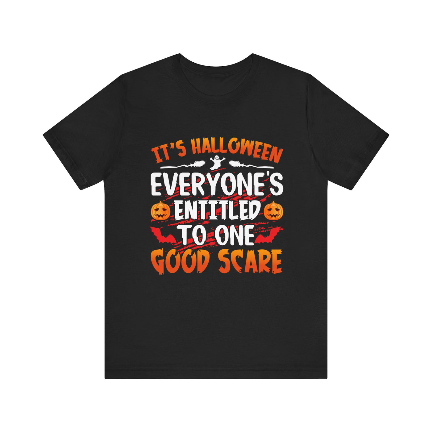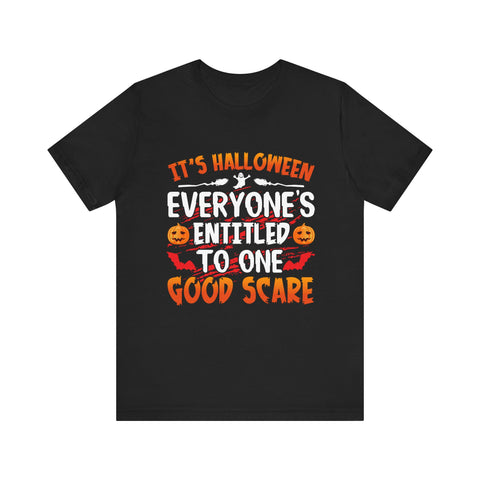 Get ready to celebrate Halloween with this fun and quirky t-shirt! Made for those who know how to have a good time, this shirt features the phrase "It's Halloween Everyone Entitled To One Good Scare". Perfect for parties, trick-or-treating, or just showing off your holiday spirit.