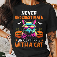 This Halloween tee reminds us not to judge a book by its cover. With a quirky design of an old hippie and their cat, this tee is sure to bring some laughs. Show your playful side and make a statement with this unique shirt.